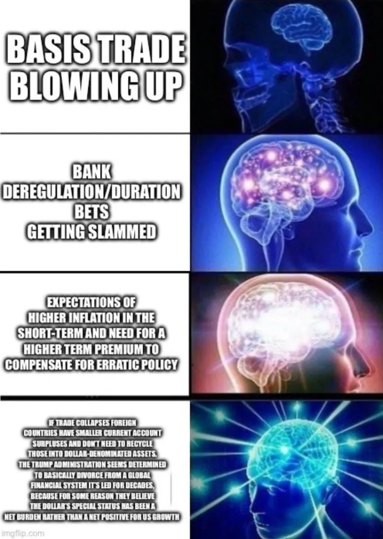 我們討論的不僅是一個依賴技術性套利的槓桿策略崩盤(儘管這顯然也不是好事),而是一個曾理性押注特朗普政策(去監管)卻未能兑現的槓桿交易坍塌,再加上實際資金賬户——那些為美國數萬億美元債務提供融資的大型投資者——的集體罷買行動。