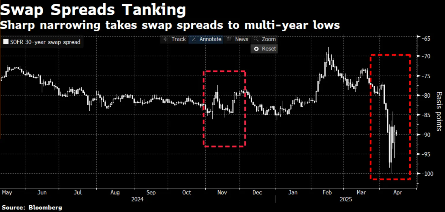 首先,投資者正在緊急叫停一項放鬆監管/久期交易策略。該策略在11月大選前後盛行,押注新政府將放寬銀行監管規定,預期國債表現將優於利率互換。上週該策略崩盤導致互換利差(國債與利率互換的差值)暴跌,部分期限品種甚至創歷史新低。