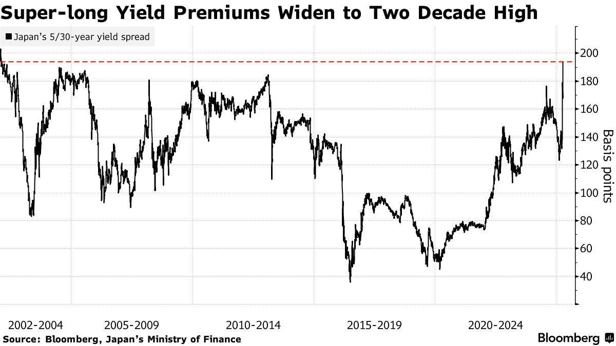由於全球市場波動和財政擔憂推高超長期債券收益率,投資者持有日本30年期國債相對於5年期國債所要求的溢價已擴大至二十多年來的最高水平。
