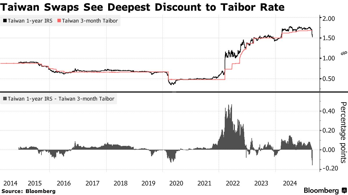 目前一年期利率互換較三個月期台北銀行同業拆借利率低約16個基點,而3月時還高出8個基點,這是自2014年彭博開始追蹤該數據以來的最大負利差。上一次出現倒掛現象是在2024年2月。