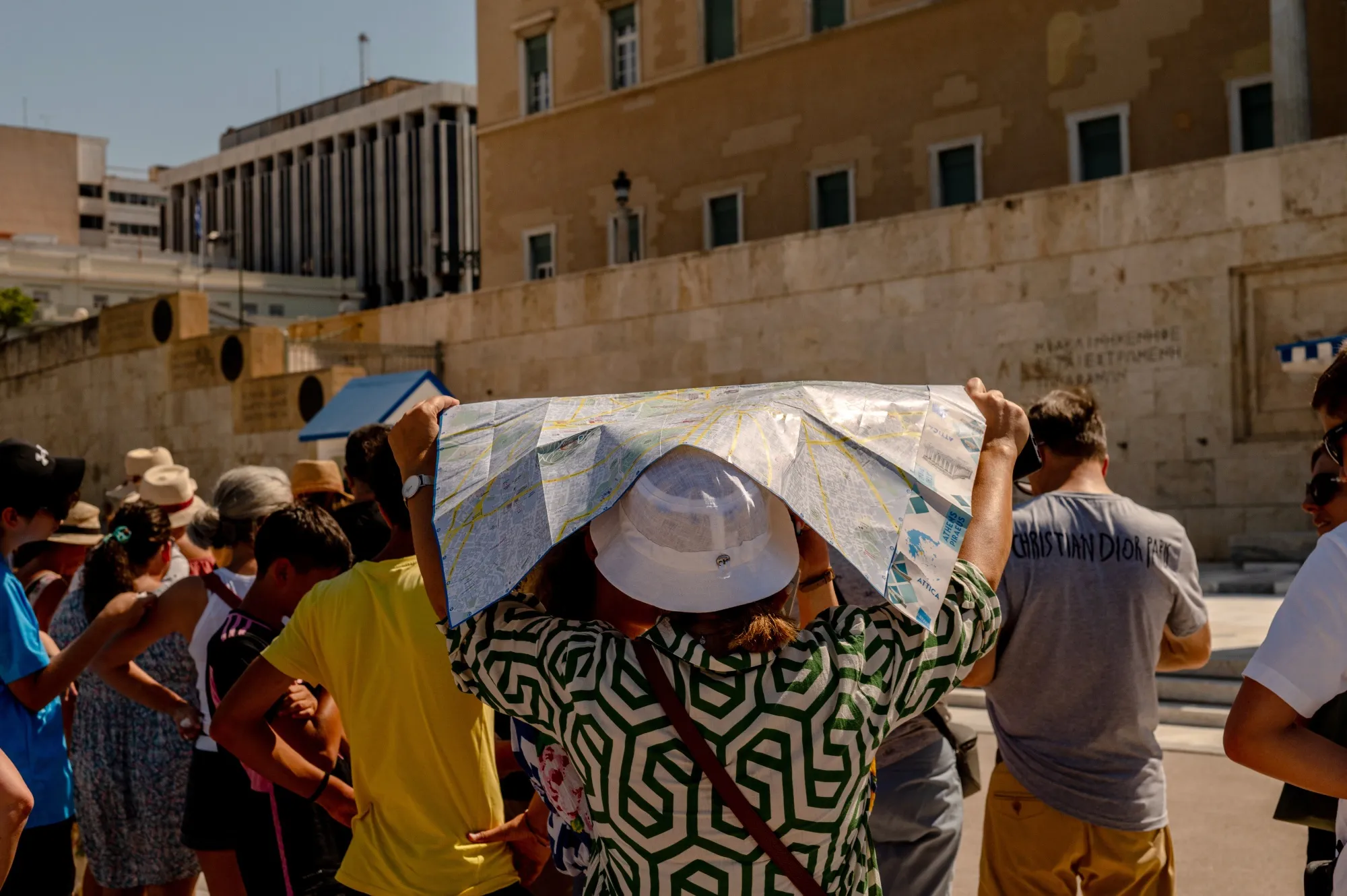 七月雅典憲法廣場高温期間,一名女子用地圖遮擋陽光。攝影師:希拉里·斯威夫特/彭博社### 更多彭博資訊