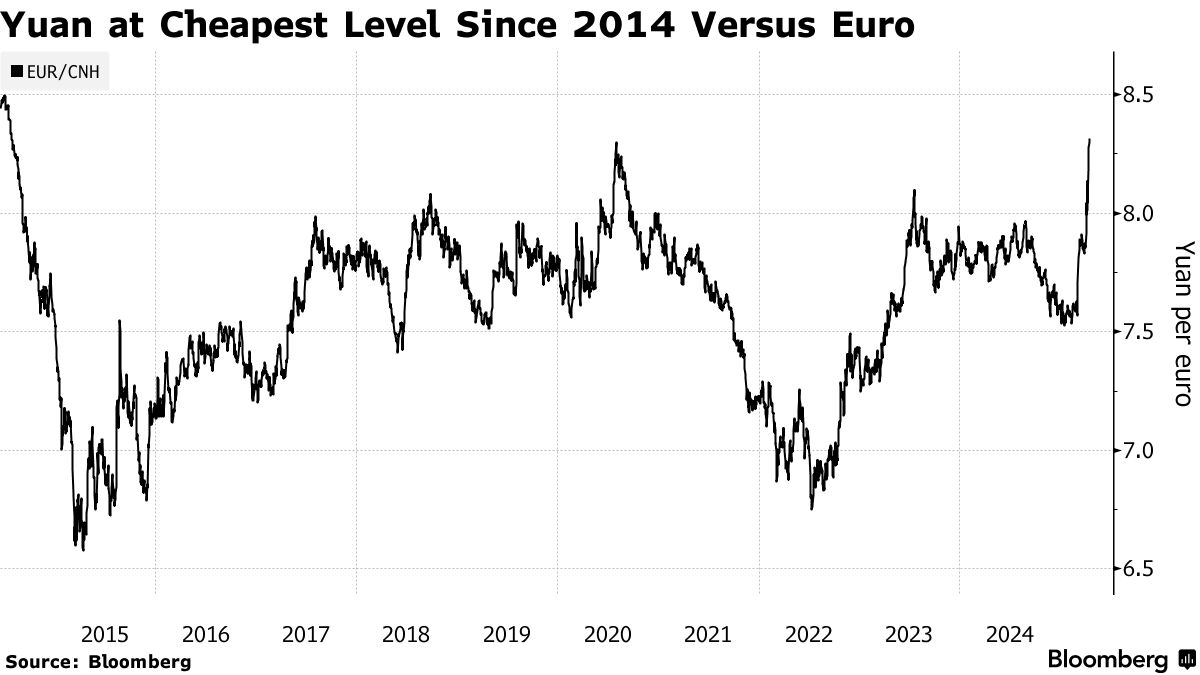中國人民幣對歐元匯率已跌至十多年來的最低點,正值唐納德·特朗普總統的關税洪流威脅要改變來自世界第二大經濟體的貿易流向。