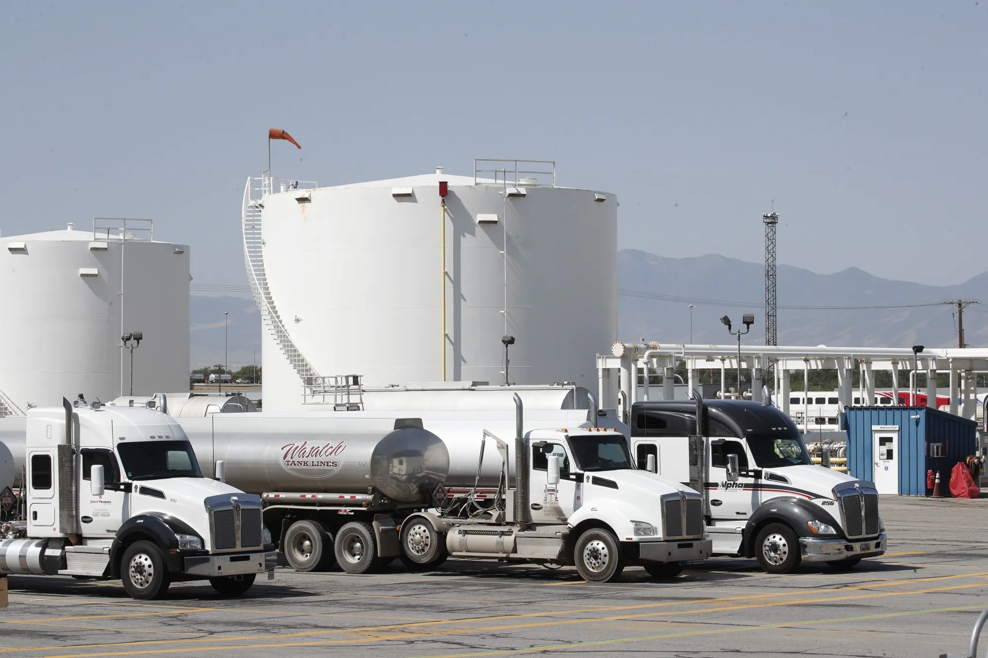 油罐車在猶他州鹽湖城一處煉油廠外排隊等候。