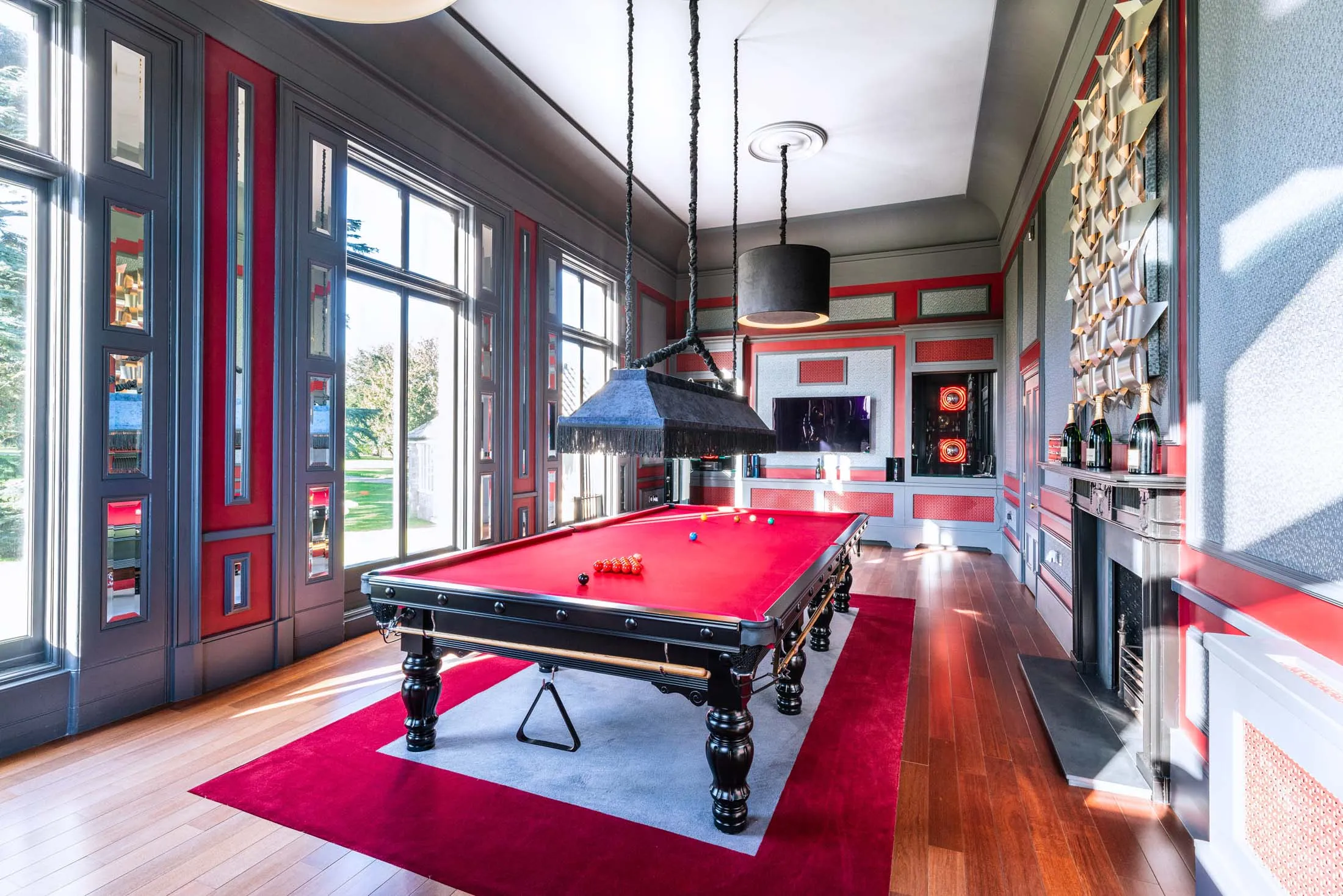 遊戲室。攝影師:Andy Scott/Knight Frank在那個側翼,有一個客廳、一個配有斯諾克桌的遊戲室,以及Waddell最喜歡的部分——帶有躺椅的電影室,他可以在這裏翹起腳放鬆。“我們在電影室上花費了數十萬英鎊,”Waddell説。“我們有一個移動屏幕和音響系統,全部由一家名為Synergy Controls的公司完成,他們負責倫敦所有億萬富翁的住宅。”