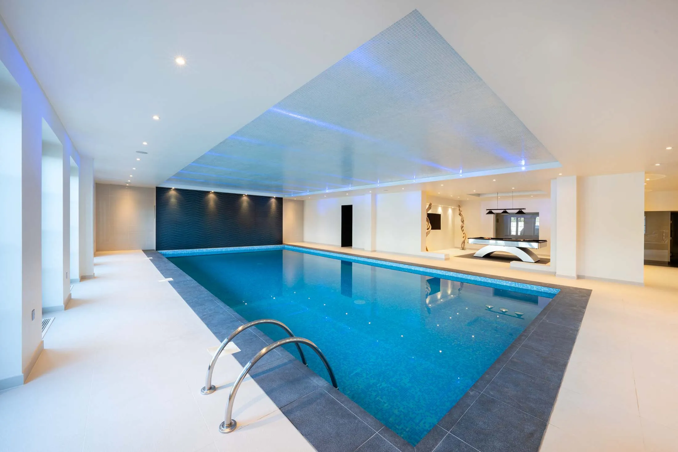 家中的室內泳池。攝影師:安迪·斯科特/萊坊國際沿着宏偉的樓梯上到二樓,共有七間卧室。可俯瞰莊園景緻的主套房內設有男女主人各自的更衣室。