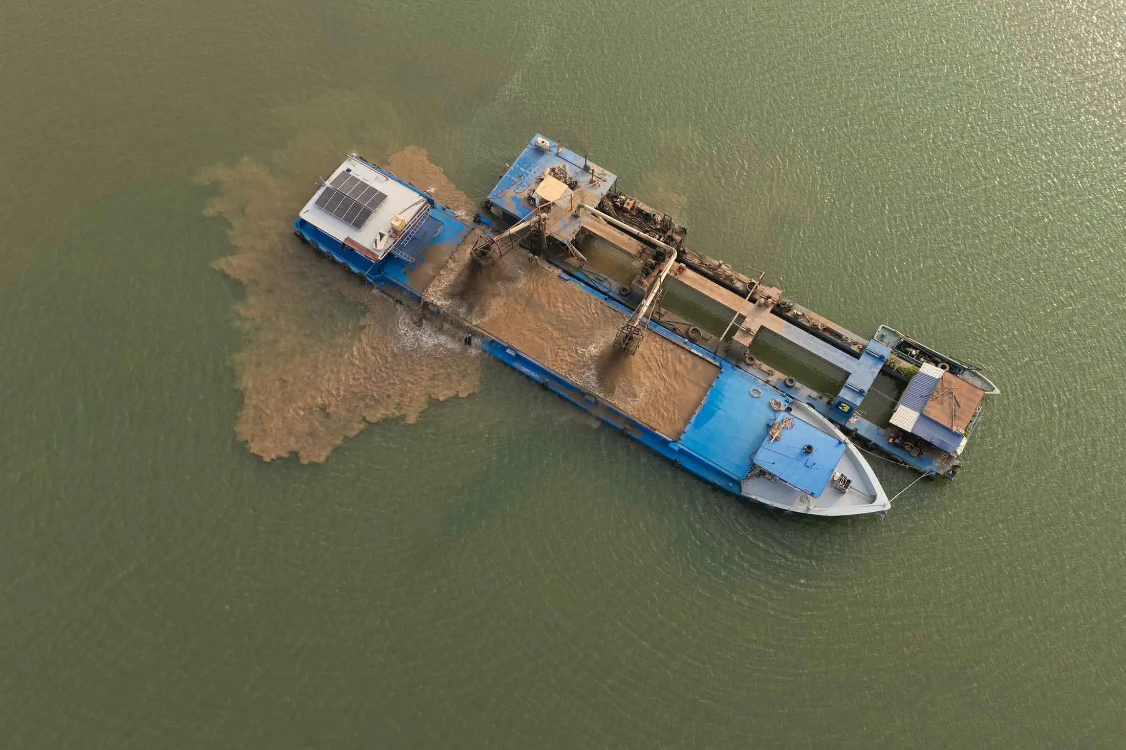挖泥船在柬越邊境的湄公河底抽砂作業。攝影:Thomas Cristofoletti/彭博商業週刊### 更多彭博資訊