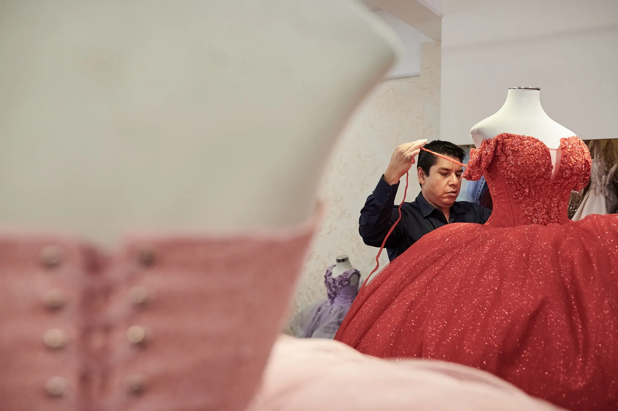 製作如圖中所示十五歲生日禮服的墨西哥設計師們,正因中國製造的更廉價禮服而失去客户。