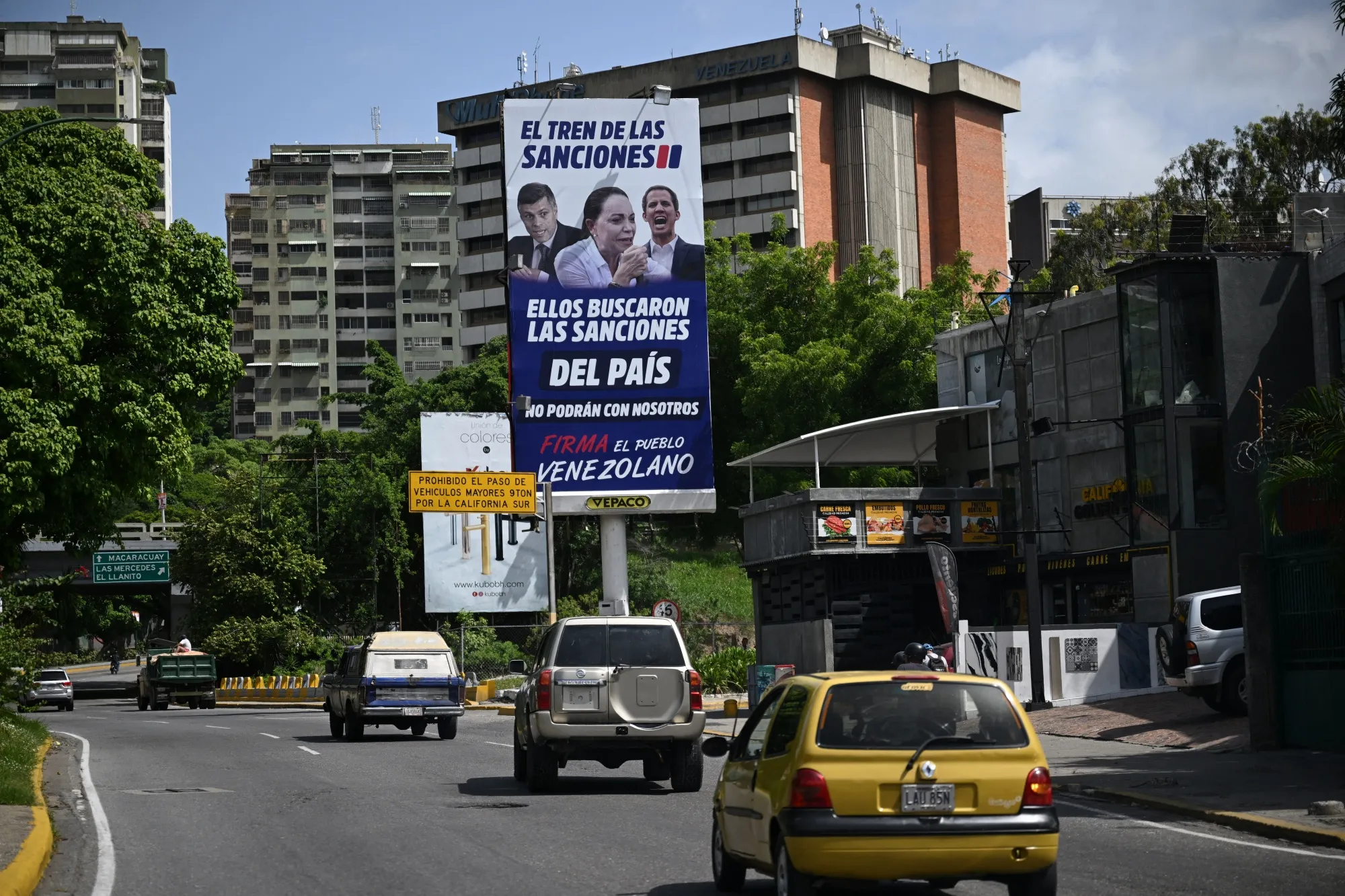 2024年7月22日,加拉加斯,反對派領導人瑪麗亞·科里納·馬查多(中)、萊奧波爾多·洛佩斯(左)和胡安·瓜伊多的抗議橫幅。照片:勞爾·阿博萊達/法新社“我們正在委內瑞拉國內非常努力地工作。雖然這些努力不顯眼,但並不意味着我們沒有在做,”馬查多説。“我們正在推進對政權的孤立,並削弱其支撐的支柱。”