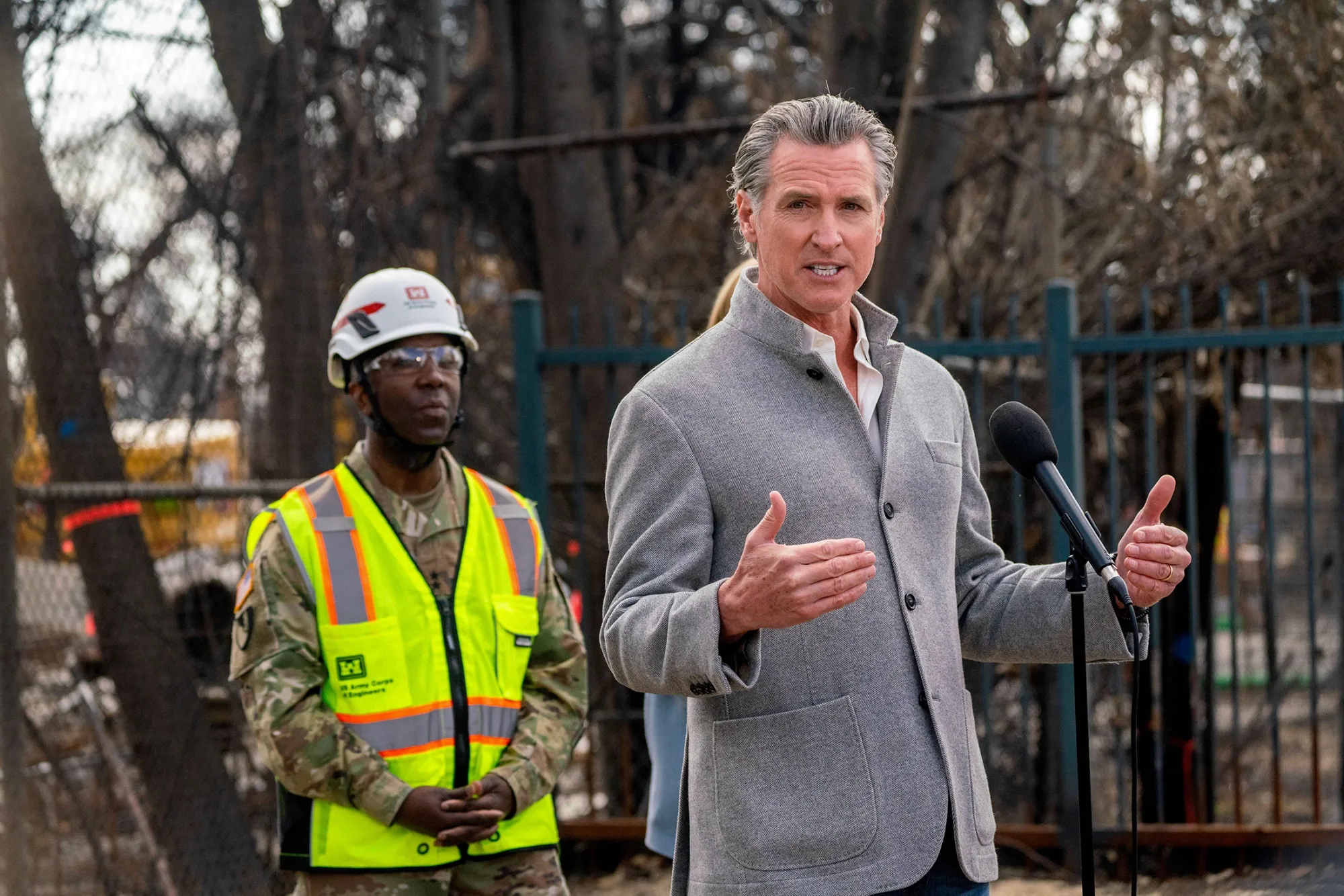 2月11日洛杉磯山火過後,加州州長加文·紐瑟姆(右)在阿爾塔迪納市與美國陸軍工程兵團舉行新聞發佈會。