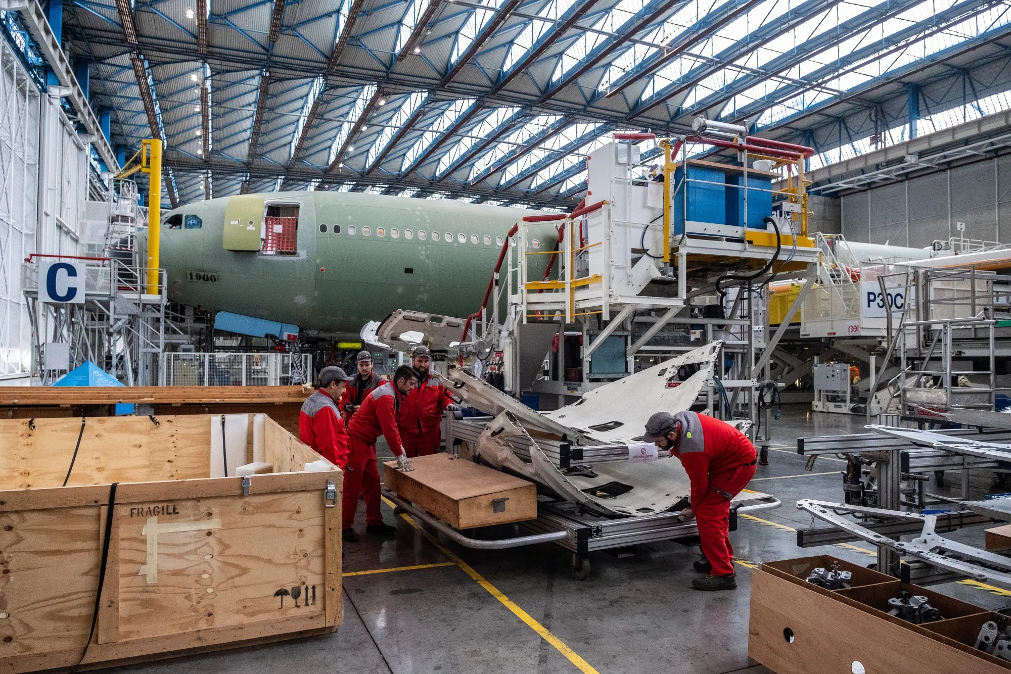 法國圖盧茲空客SE工廠內,員工正在組裝線上操作機身面板。