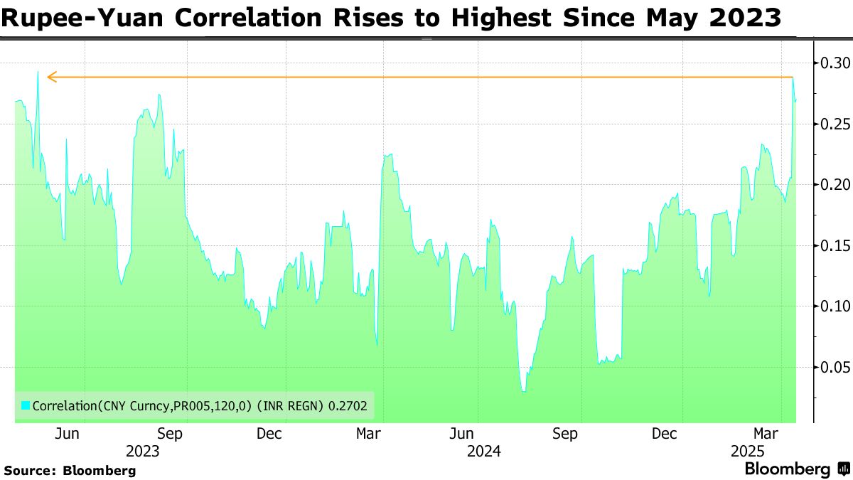 盧比與在岸人民幣的120天相關性已變得比以往更強,本月更是升至0.29的高位。而一個月期盧比無本金交割遠期與人民幣的30天相關性更高,達到0.66。這為印度央行應對當前全球貿易戰影響的匯率策略增添了新的挑戰。