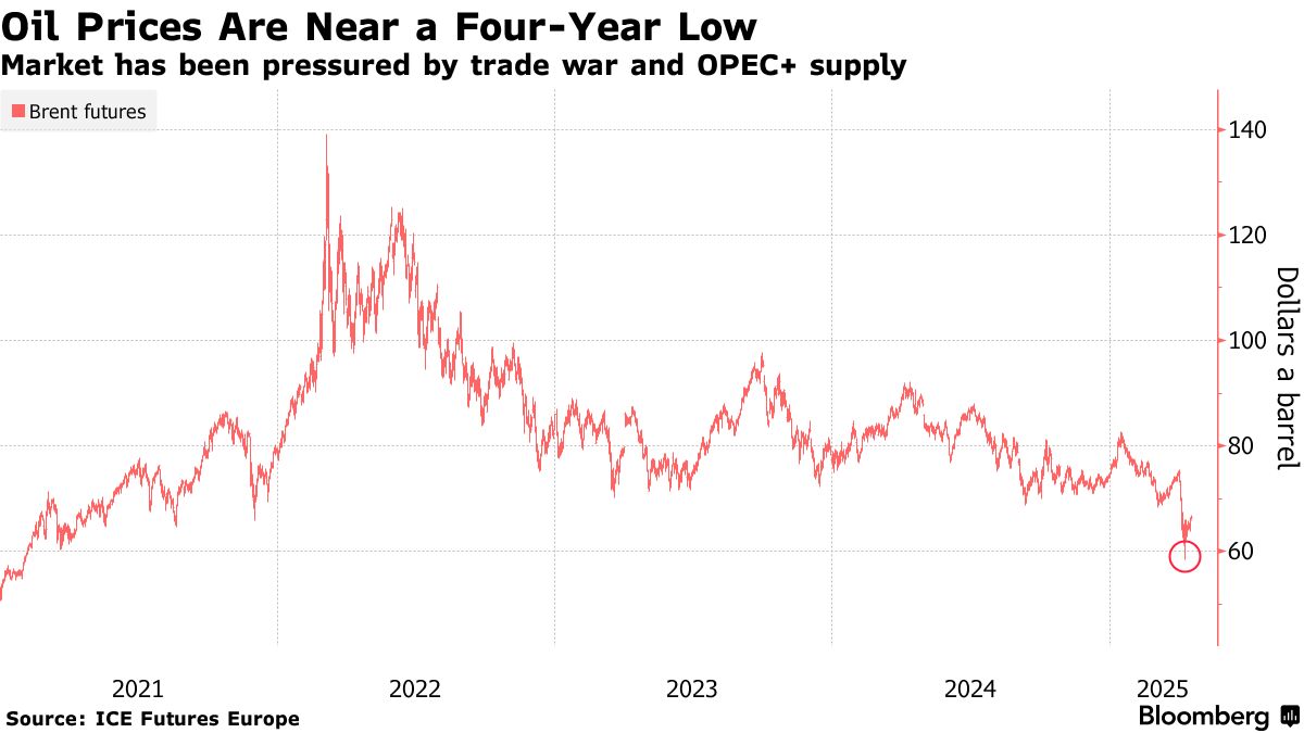 上週布倫特原油期貨跌破60美元/桶關口,創四年新低。交易員們正同時應對歐佩克+增產和可能削弱需求的全球貿易戰雙重打擊。儘管在中國釋放願與美國談判的信號後油價小幅回升,但較今年早些時候的高點仍下跌約20%。
