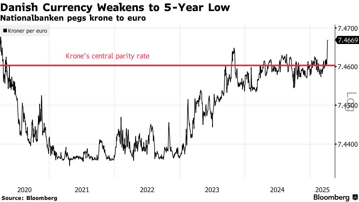 儘管丹麥央行將克朗匯率維持在1歐元兑7.46038克朗的2.25%波動區間內,但實際操作中目標區間更窄。自2023年初以來,這個北歐國家始終將基準利率維持在低於歐洲央行40個基點的水平,以抵消主要由諾和諾德等製藥巨頭出口繁榮帶來的克朗升值壓力。