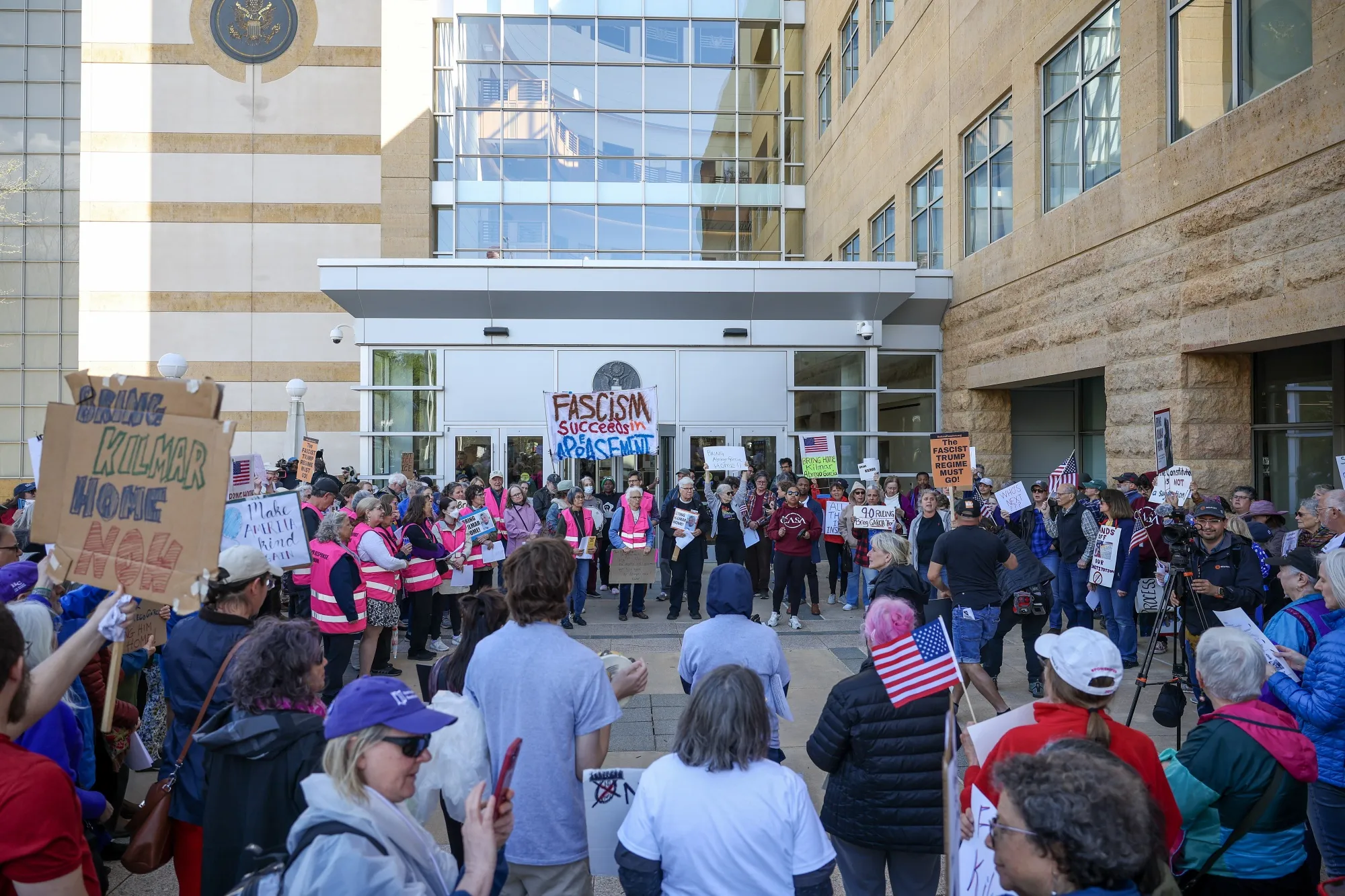 4月15日,馬里蘭州格林貝爾特美國地方法院外,支持基爾馬爾·阿布雷戈·加西亞的示威者舉着標語牌。攝影師:塔索斯·卡託波迪斯/蓋蒂圖片社在美國最高法院駁回下級法院法官的全國性暫停令後,移民權益組織正爭分奪秒地提起新訴訟,挑戰唐納德·特朗普總統依據一項鮮少使用的戰時法律實施的驅逐行動。
