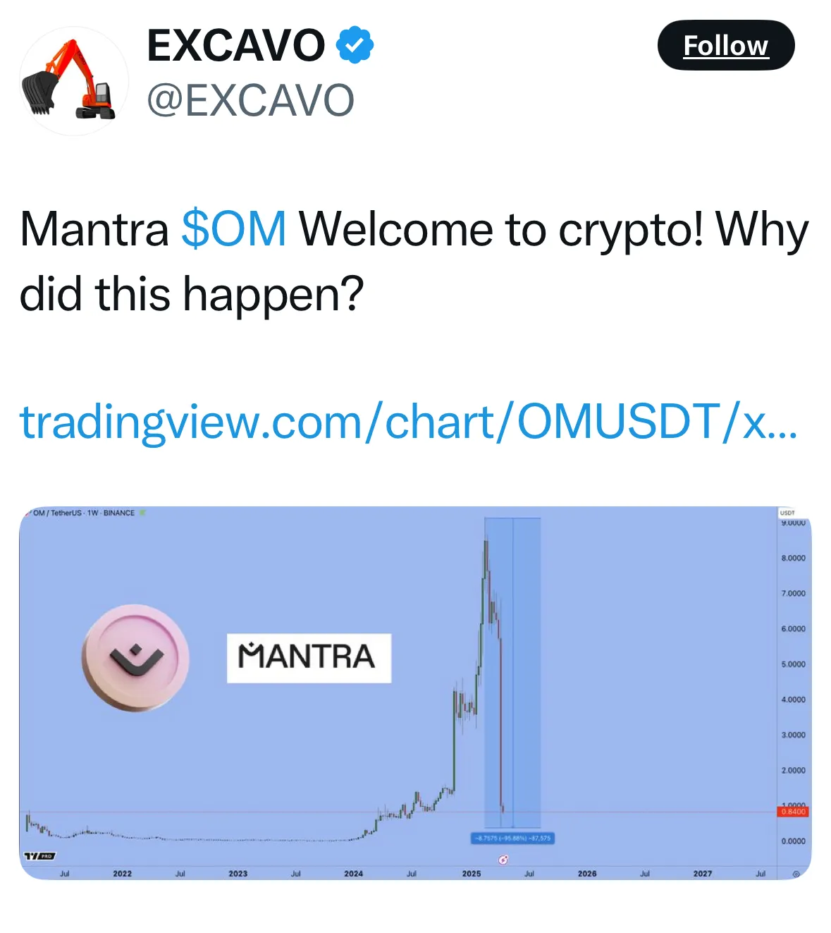 來源:@Excavo](https://x.com/EXCAVO/status/1911623551058411844)然而,這種高度集中的所有權認知會形成脆弱的市場結構,使代幣極易受到拋售壓力的衝擊。據CoinGecko數據顯示,在崩盤前投資者似乎忽視了這一危險信號——OM價格過去一年持續飆升,並於2月創下9美元的歷史新高。Mantra團隊未回應通過X平台私信發送的置評請求。