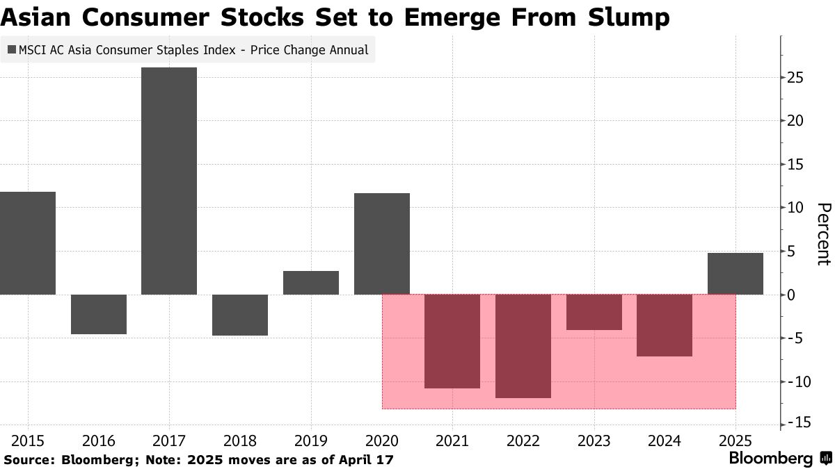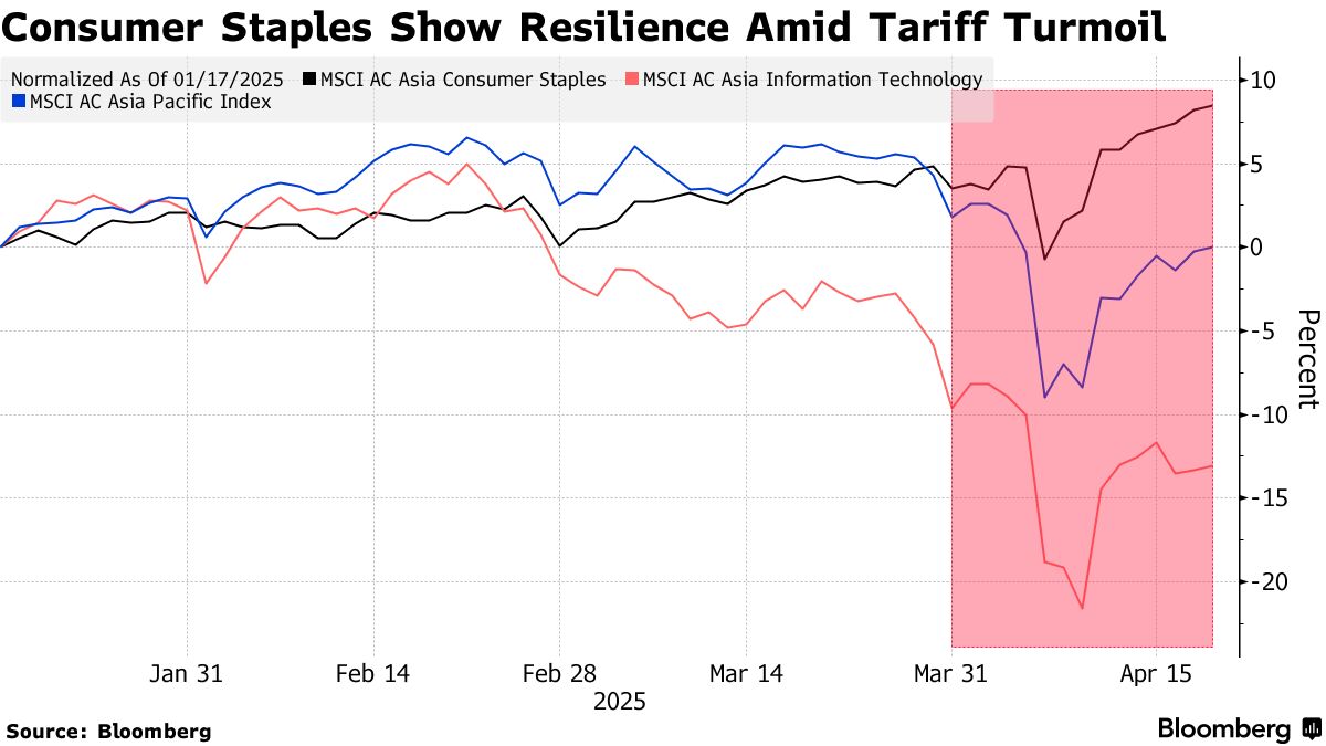 全球貿易戰正為亞洲消費股帶來利好,投資者紛紛湧入那些滿足本地消費者基本需求的企業以尋求避險。