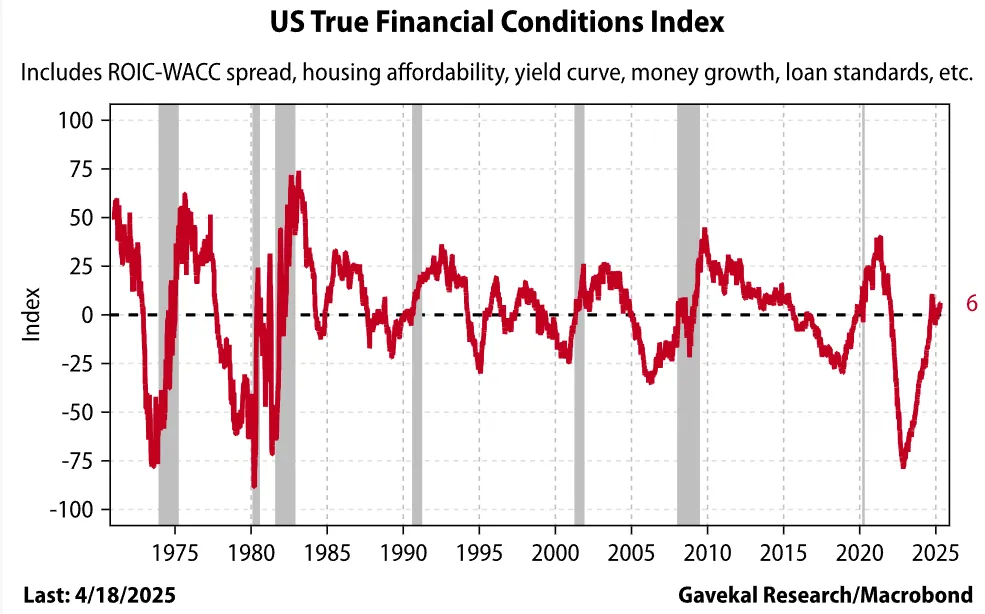龍洲經訊的Will Denyer指出,此類指數衡量的是風險偏好,而非促進信貸增長的"真實"環境。以下指數通過綜合貨幣供應增長、收益率曲線、銀行業活力指標、實物資產企業投資回報率與實際融資成本利差,以及住房可負擔性指標來捕捉真實狀況。該指數顯示,當美聯儲在2022年遲來地應對通脹時環境極度緊縮——而當前則處於正常且略微寬鬆的環境:
