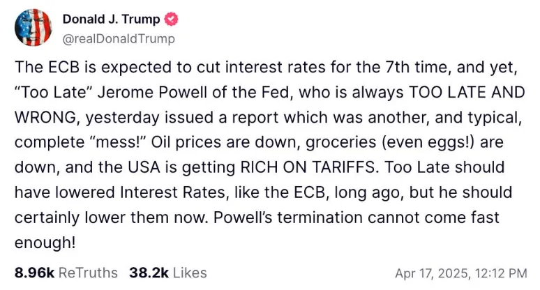 換言之,關税引發的物價一次性上漲可能同時推高通脹和失業率,迫使美聯儲加息。這引發了總統在Truth Social平台的發文: