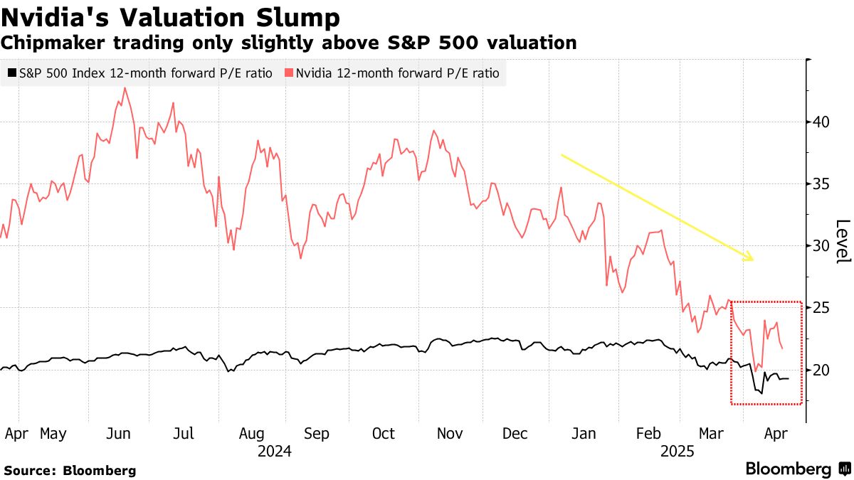 英偉達股價暴跌導致的估值下挫,凸顯出這家芯片製造商面臨的雙重風險:AI支出可能放緩,以及特朗普政府試圖重構全球貿易關係。若貿易緊張局勢引發經濟衰退,所有關於未來盈利的預期都將失效,估值基礎將被動搖。