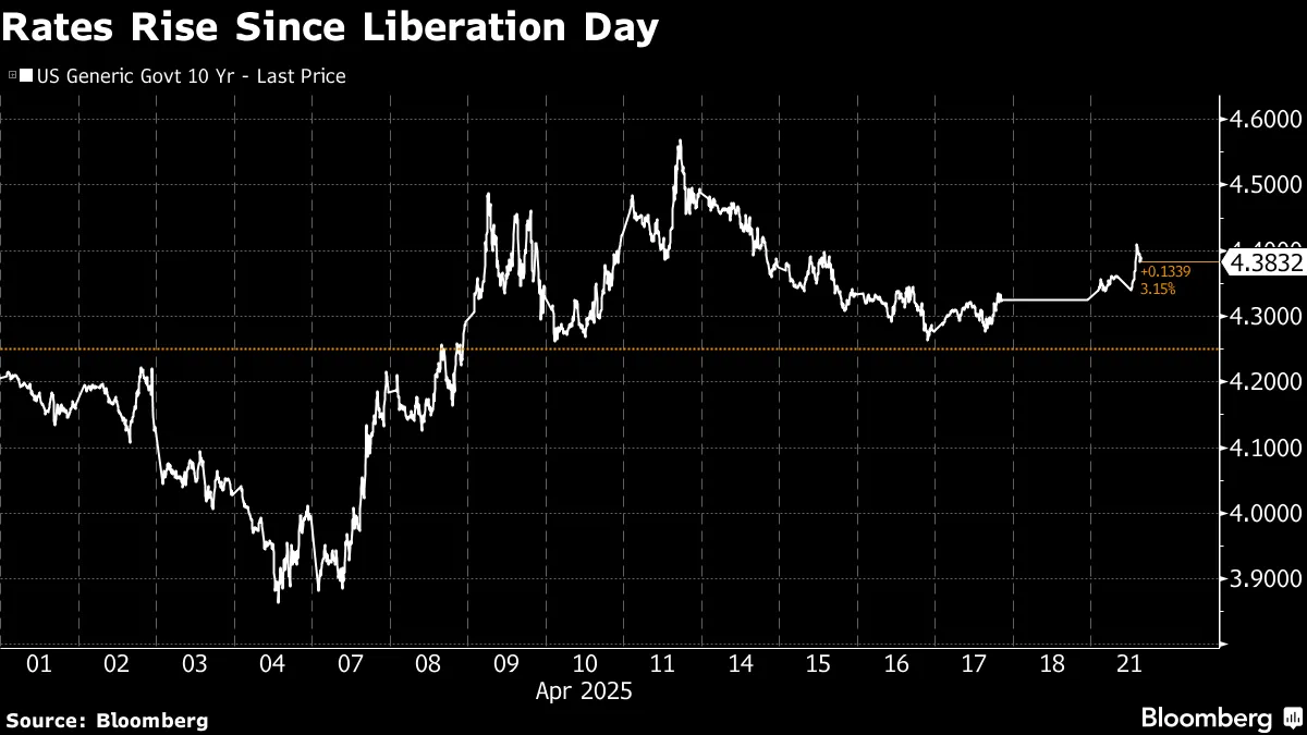 對特朗普(以及所有參與美國經濟的人)來説,最令人不安的圖表之一可能是:自"解放日"以來,我們看到美國股市出現了大規模避險行為,但長期政府債券的收益率卻上升了。