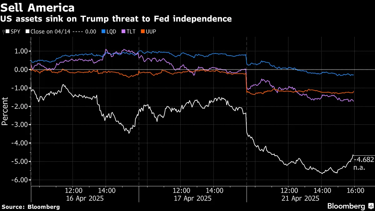 特朗普關於關税談判取得進展的保證未能阻止跌勢,市場擔憂他可能因鮑威爾拒絕更快降息而準備解僱後者。總統週一在Truth Social發文,加大了對美聯儲主席的施壓,堅稱"幾乎"不存在通脹,是時候進行預防性降息。美聯儲青睞的通脹指標最新讀數仍高於央行目標,下週將公佈新數據。