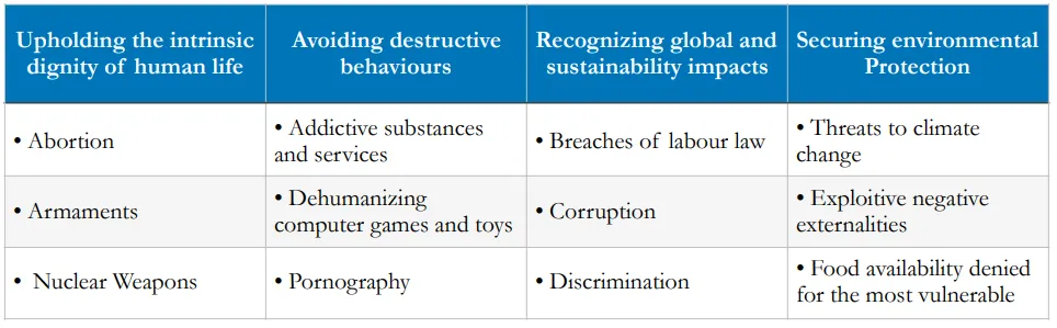 《Mensuram Bonam》的方法認為,受託人必須明白,作為更廣闊世界的一部分,以及作為後代資源的守護者,某些盈利手段是不可觸碰的。完整的46頁文件可在此處找到:這裏。其建議的可能引發關注或禁止的類別列表如下: