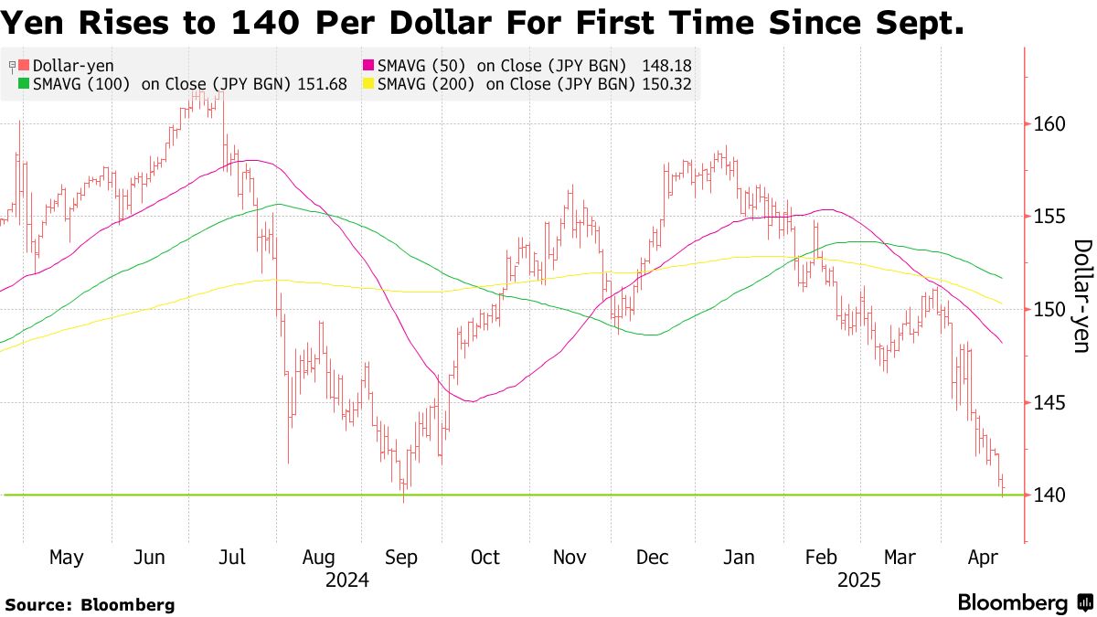 週二日元兑美元突破140關鍵心理價位——成為十國集團貨幣中表現最佳幣種——因美國資產風險上升促使投資者尋求美元替代品。瑞穗證券策略師表示,受美股下跌及美日會談影響,日元可能測試2024年139.58的峯值。