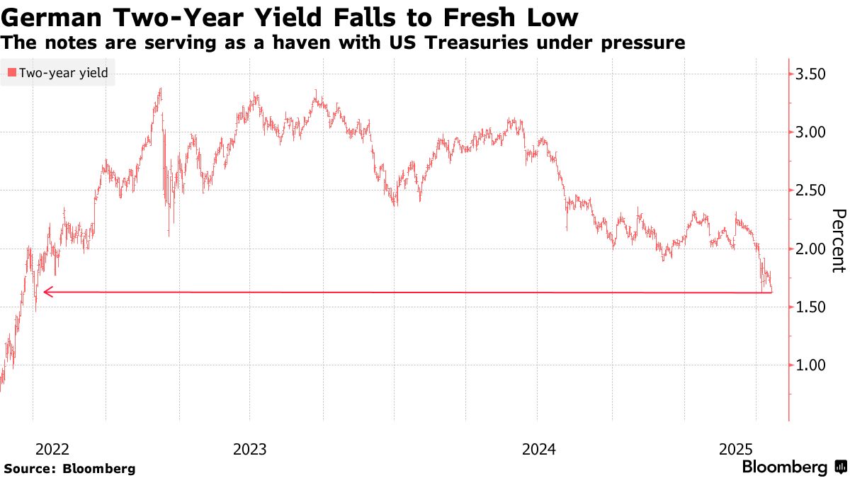 短期美國票據表現不佳,而長期票據在週一大幅下跌後趨於盤整。這與德國債券全線走強形成鮮明對比——該國兩年期收益率驟降6個基點至2022年以來最低水平。