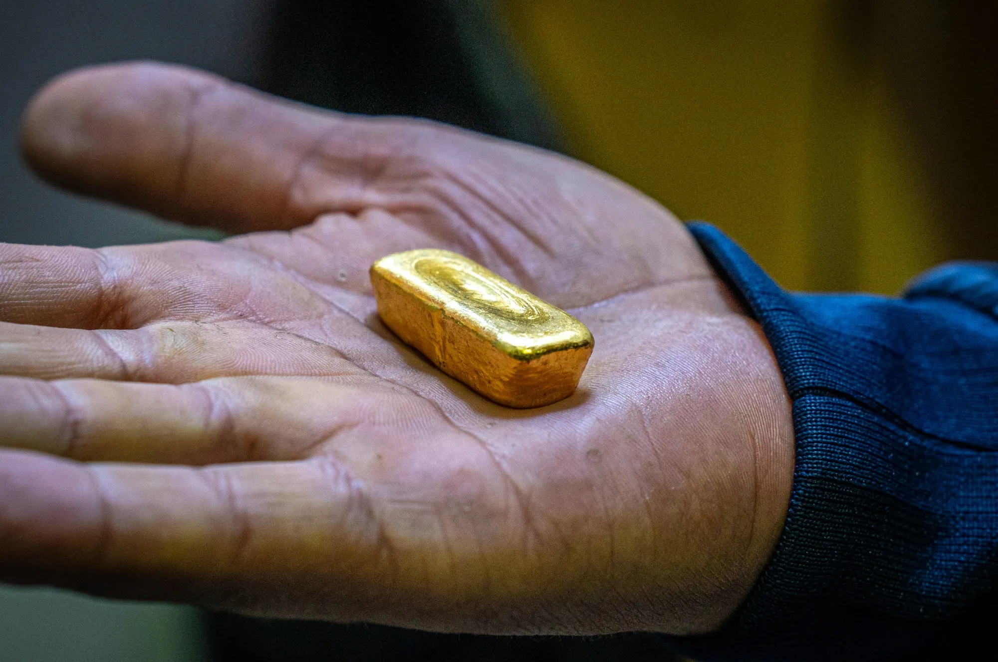 哥倫比亞馬爾馬託鍊金廠,一名工人手持加工好的金錠。