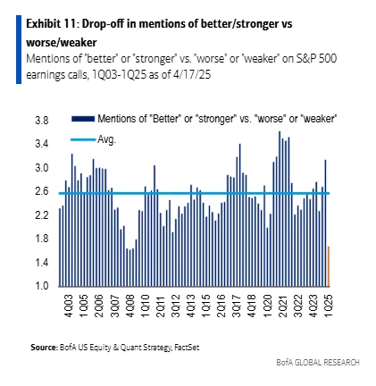 根據美國銀行對早期財報電話會議的分析,本財報季中關於宏觀經濟狀況的正面與負面評論比例遠低於平均水平,正朝着2009年以來最差比例發展。