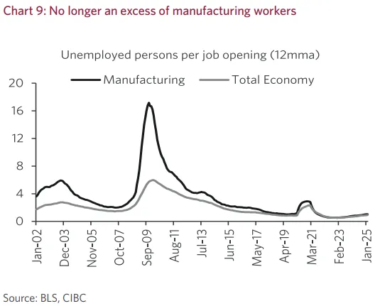 隨着特朗普政府試圖將製造業產業鏈遷回美國,核心問題在於美國工業及其勞動力能否勝任這一任務。加拿大帝國商業銀行經濟學家安德魯·格蘭瑟姆和艾弗裏·申菲爾德在週二的報告中分析了這一現狀。