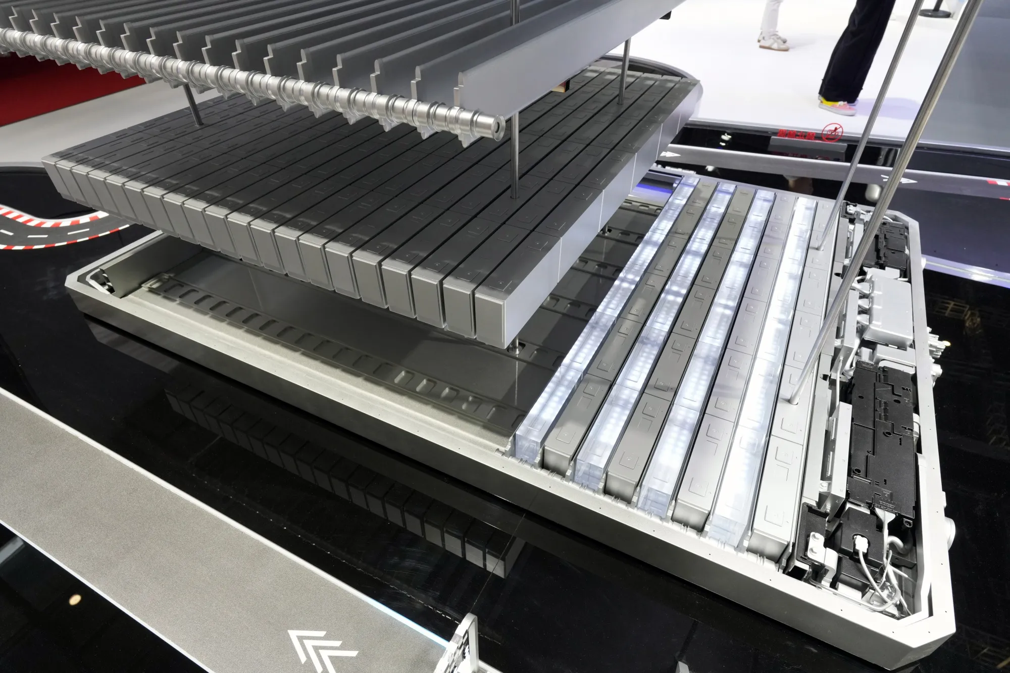 展會上展示的寧德時代電池剖面。攝影師:沈啓來/彭博社許多企業並未等待展會開幕就展示了最新產品和技術進展。寧德時代週一發佈了一款據稱僅需五分鐘充電即可實現520公里(323英里)續航的電池。這直接對標比亞迪,後者近期推出的電池系統宣稱能在相近時間內提供400公里續航。