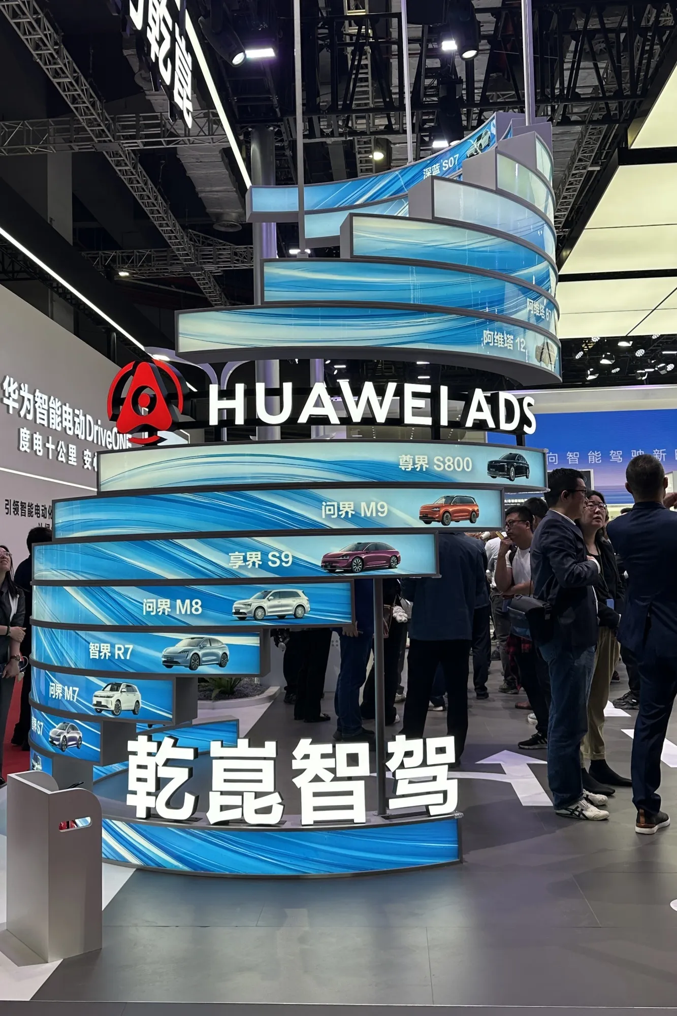華為階梯展台。圖片來源:彭博社華為展台通過階梯式陳列展示搭載其智能駕駛系統的車型,官方稱該系統已避免200萬次潛在碰撞。儘管市場對華為技術熱情不減,中國監管部門正加強審查高級駕駛輔助系統,並要求車企更明確説明產品功能邊界。