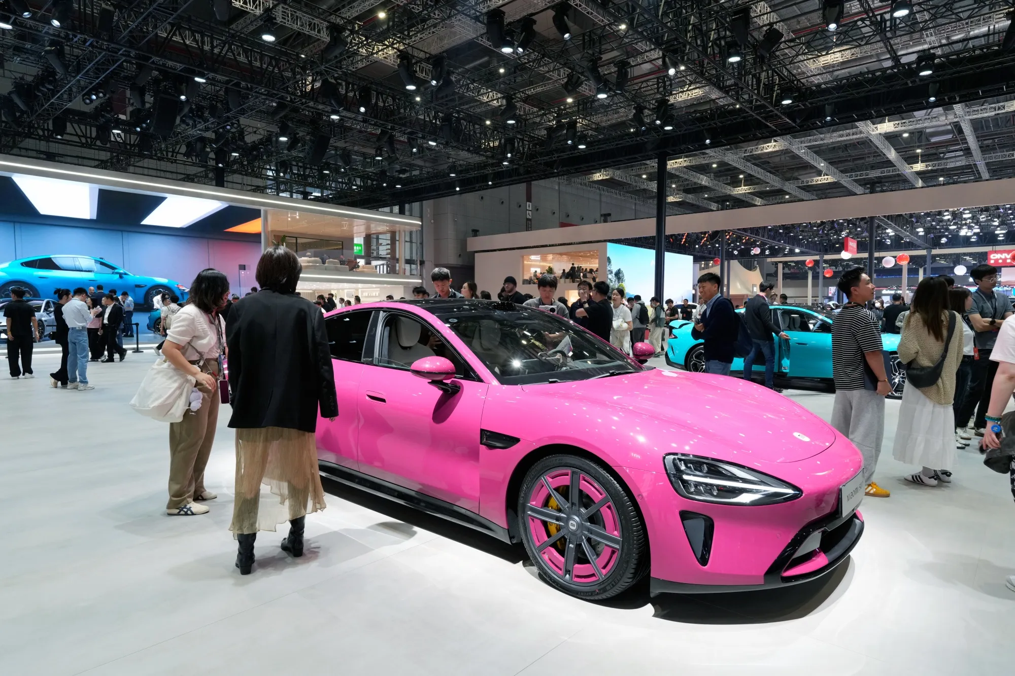 小米SU7。攝影師:沈祺來/彭博社儘管其SU7電動車型近期致命車禍引發爭議,並推遲了首款SUV上市計劃,小米展台仍大受歡迎。翡翠綠與銀色塗裝的兩台SU7 Ultra高性能版電動車吸引了最密集的人羣。