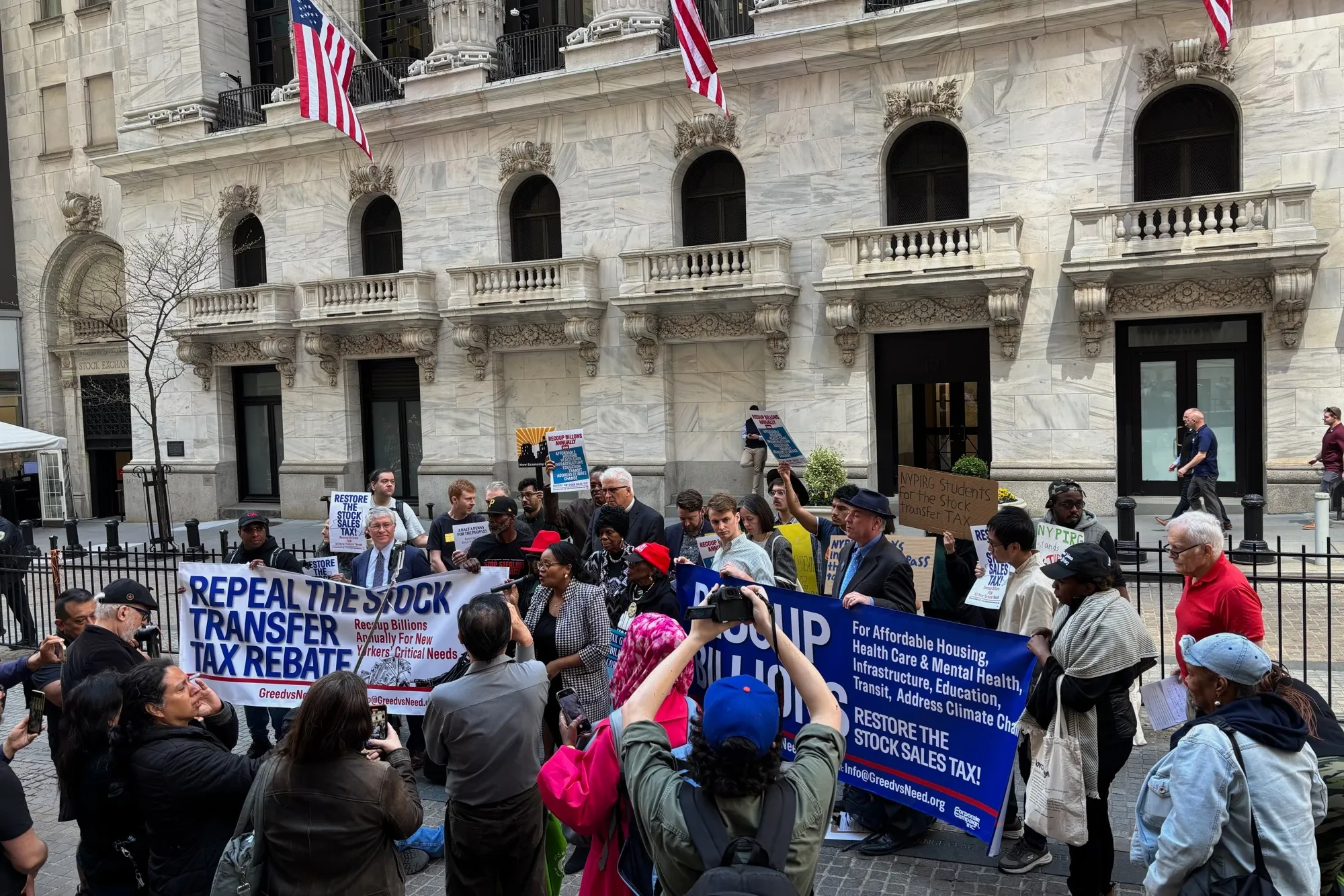 4月23日,支持者在紐約證券交易所外舉行活動,提議對股票交易徵税。攝影師:米歇爾·卡斯基/彭博社特朗普政府可能大幅削減聯邦資金,這重新引發了恢復紐約股票銷售税的呼聲。