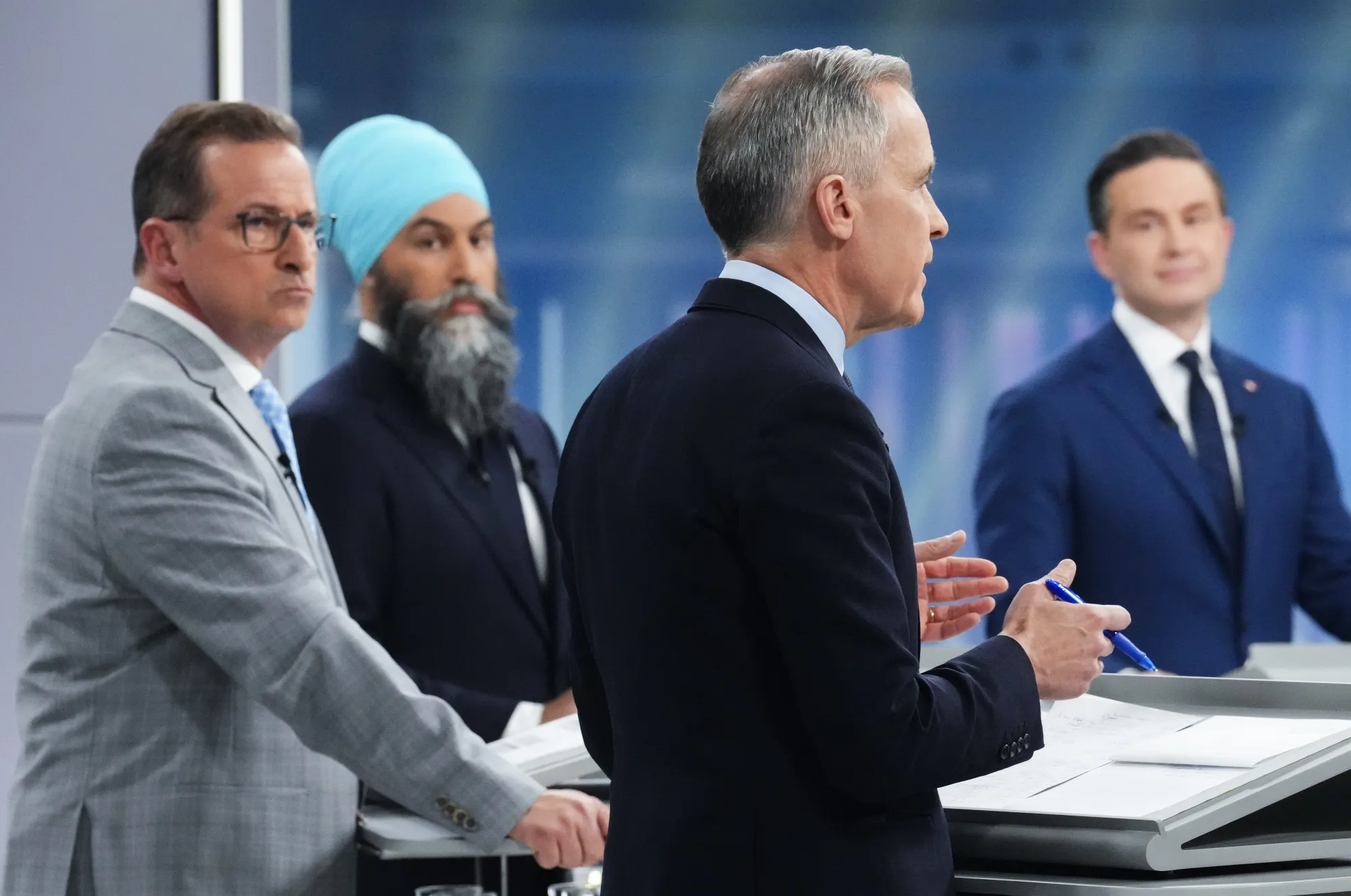 加拿大總理兼自由黨領袖馬克·卡尼(前景)在選舉辯論中發言,右側聆聽的是保守黨領袖皮埃爾·普瓦列弗。畫面中還包括魁北克集團領袖伊夫-弗朗索瓦·布朗謝和新民主黨領袖賈格米特·辛格。