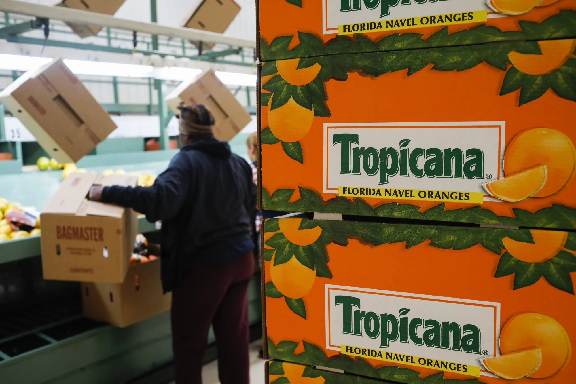 佛羅里達州維羅海灘包裝廠內成箱的Tropicana臍橙產品。