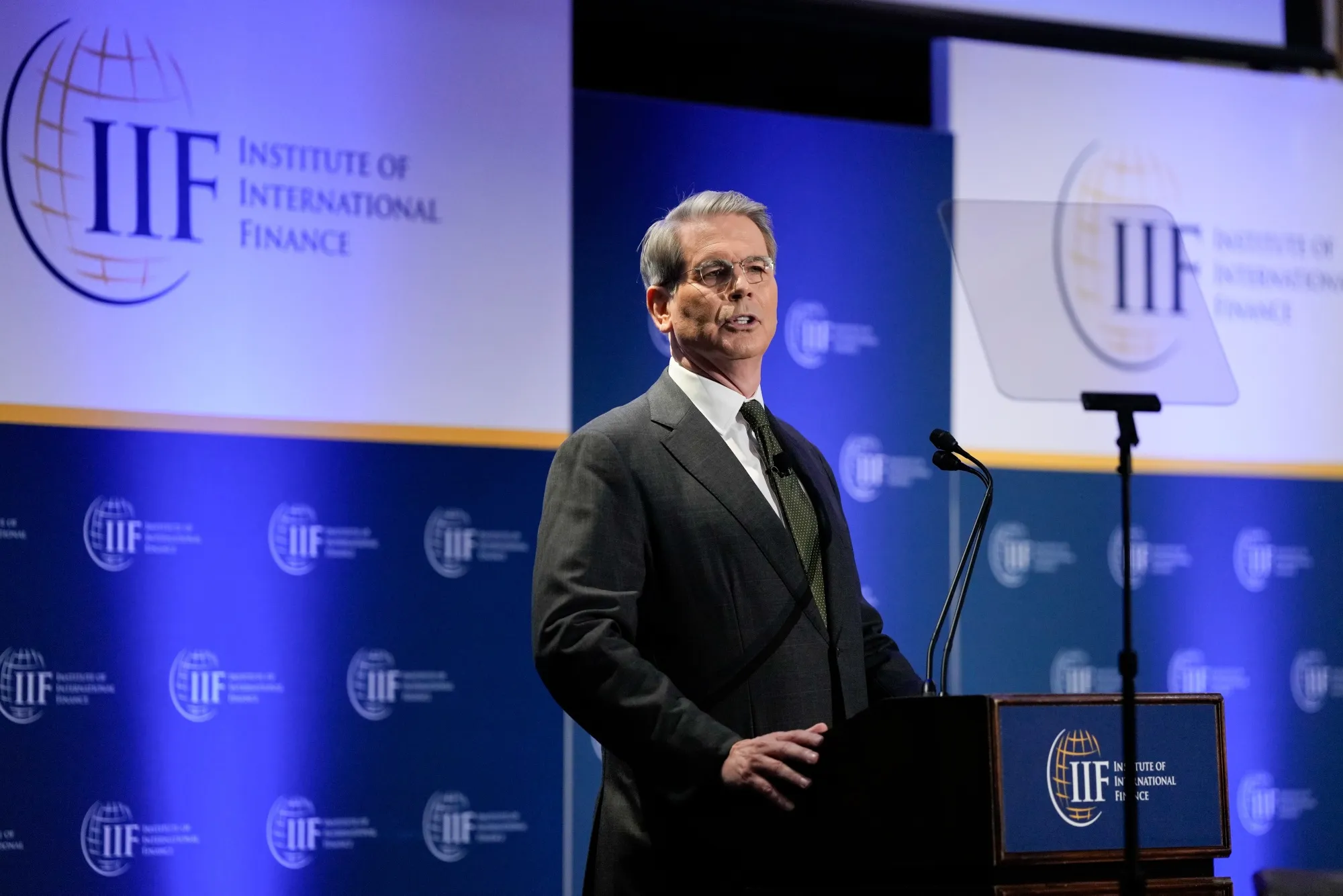 4月23日,斯科特·貝森特在華盛頓特區國際貨幣基金組織(IMF)和世界銀行春季會議期間的IIF全球展望論壇上發表講話。攝影師:肯特·西村/彭博社 精彩不容錯過。立即關注每日播客《大事件》。
