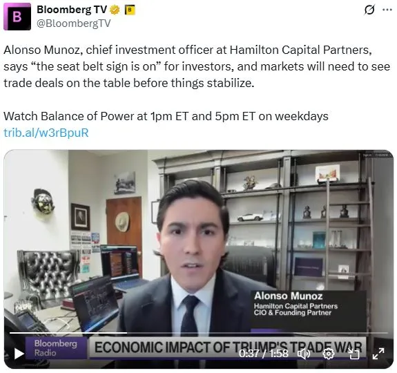 今天下午1點,彭博電視台《權力平衡》早間版的主持人喬·馬蒂厄和凱莉·萊因茨採訪了漢密爾頓資本合夥公司的首席投資官阿隆索·穆尼奧斯,討論了金融市場對特朗普在關税和美聯儲政策轉變的反應。
