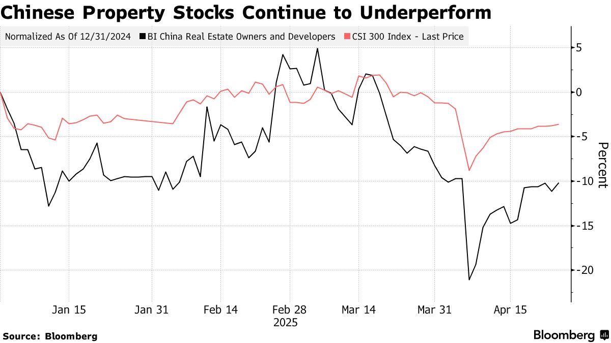 彭博情報編制的中國開發商股票指數今年已下跌約10%,表現遜於國內股市基準——滬深300指數不到4%的跌幅。