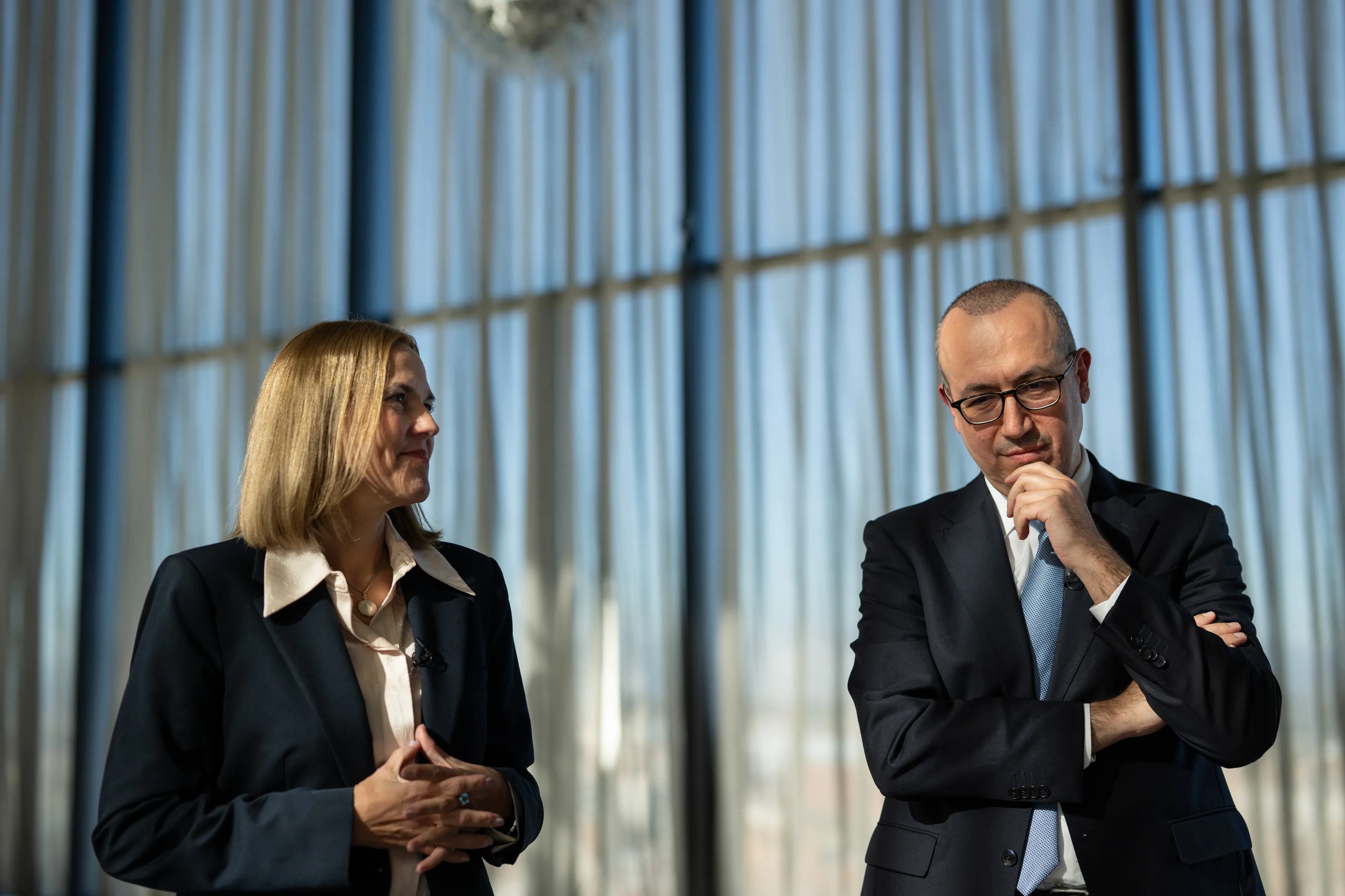 左為瑪麗亞·路易莎·戈麥斯-布拉沃,右為奧努爾·根奇。攝影師:布賴斯·洛倫佐/彭博社西班牙對外銀行首席財務官瑪麗亞·路易莎·戈麥斯-布拉沃表示,無論當前市場如何動盪,該行都將繼續尋求美國投行業務的增長。