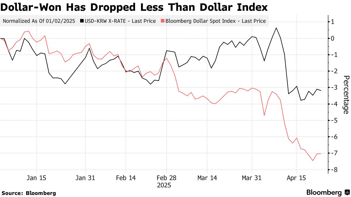 今年韓元兑美元的升值幅度不及許多其他貨幣。美元兑韓元匯率下跌約3%,而彭博美元即期指數下跌了6.3%。