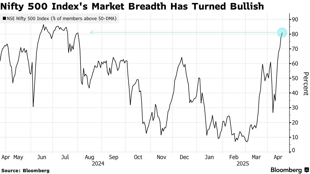 Nifty 50指數突破200日均線並非唯一令投資者振奮的看漲信號。Axis證券數據顯示,Nifty 500指數中逾80%成分股現交易於50日均線上方——表明漲勢正從大型股向外擴散。該機構指出,過去十年此形態共出現41次,其中75%案例中指數隨後20日繼續走高,期間平均回報率達1.6%。
