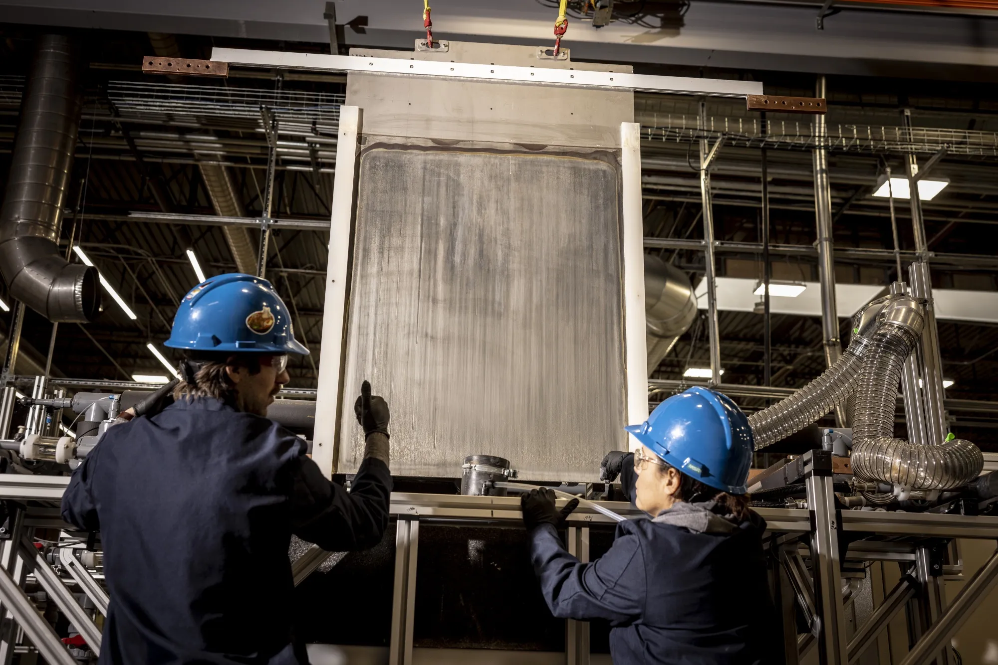在科羅拉多州甘巴雷爾的Electra生產設施,員工們正將一塊塗有99%純度鐵的陰極從電解槽中取出。