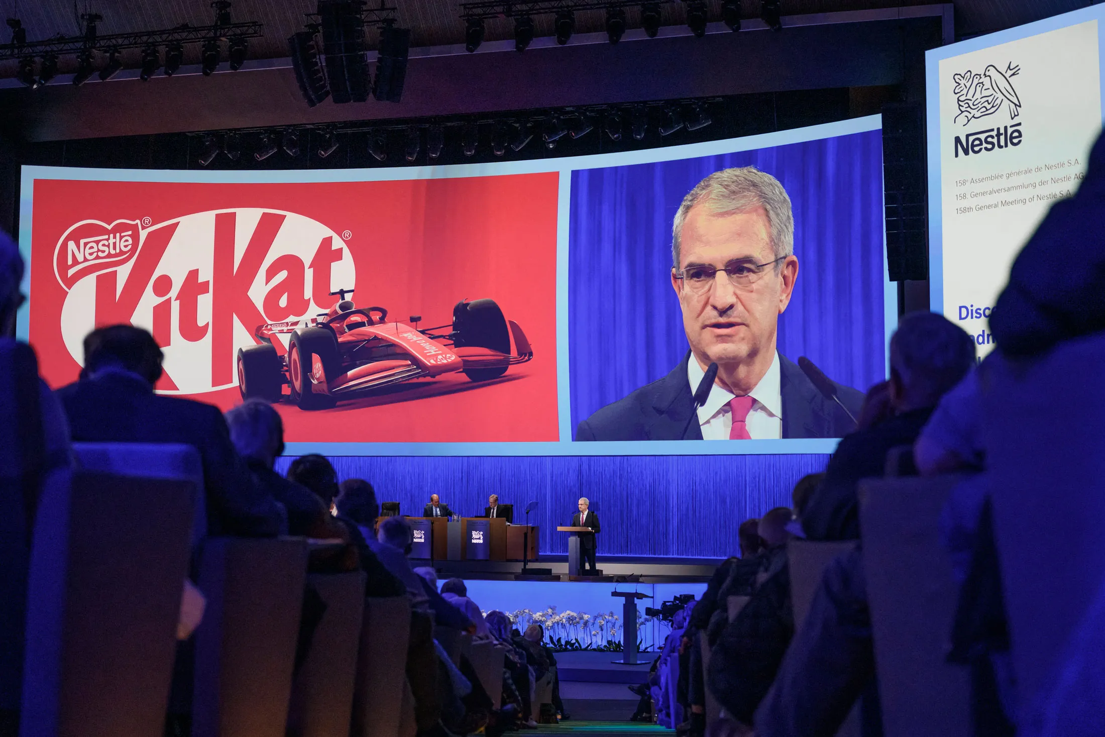 4月16日雀巢股東大會上發言的馬克·施耐德。攝影師:Gabriel Monnet/AFP/Getty Images特朗普總統的關税威脅進一步抑制了消費需求,引發對全球經濟放緩的擔憂。