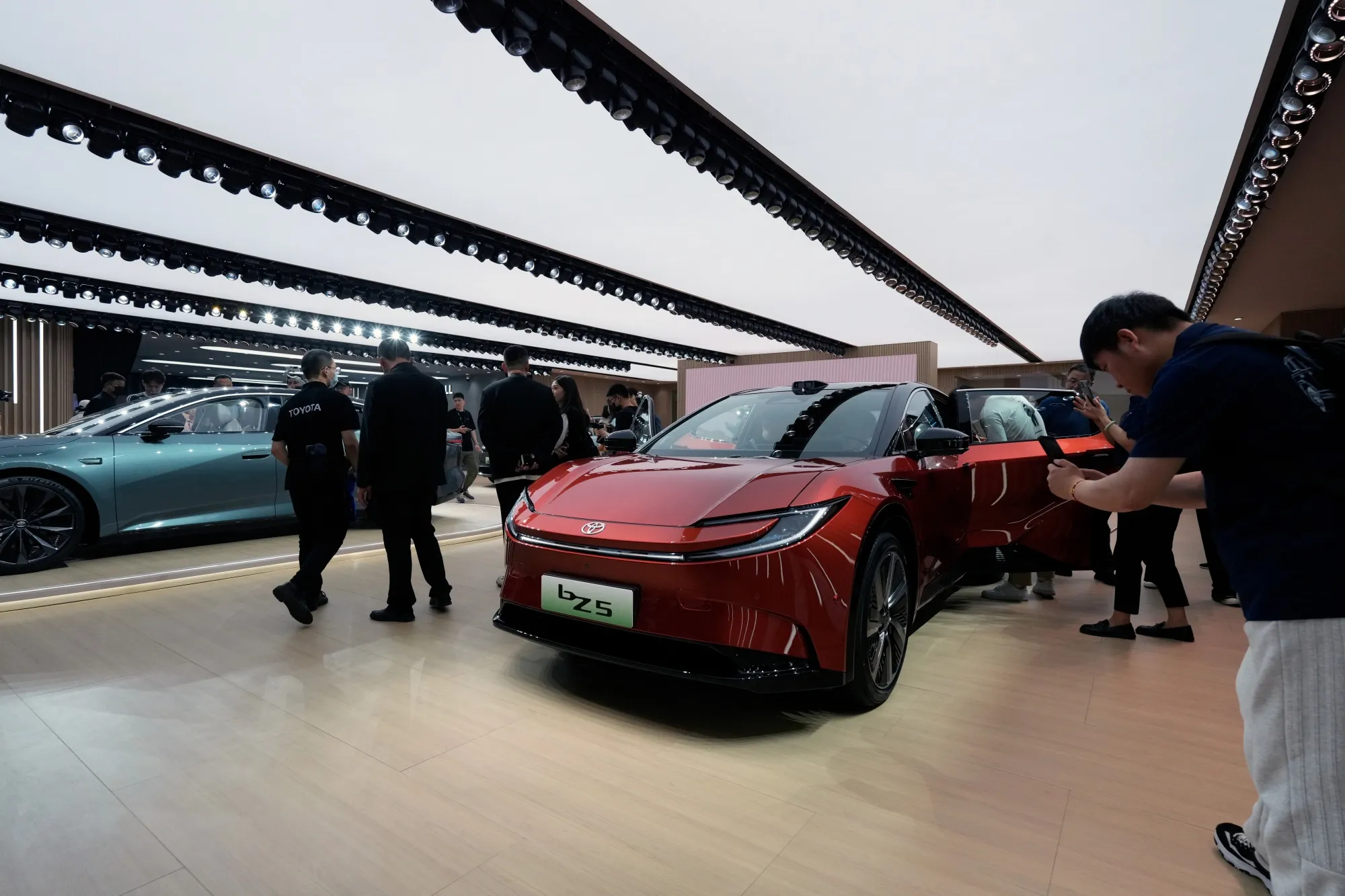 4月23日上海車展上的一輛豐田電動車。攝影師:沈起來/彭博社豐田汽車公司將成為繼特斯拉公司之後,第二家在中國運營全資工廠的汽車製造商。本週豐田正式同意在上海附近新建一家電動汽車工廠。