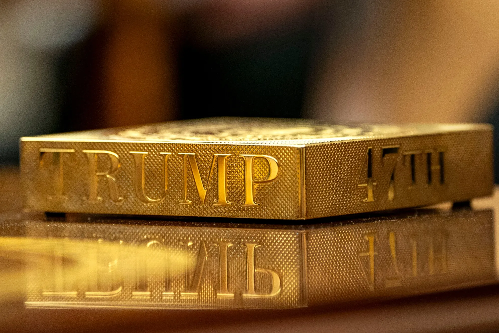 2025年2月24日,法國總統埃馬紐埃爾·馬克龍與美國總統唐納德·特朗普在白宮會晤時,咖啡桌上的黃金盃墊攝影師:邦妮·卡什/合眾國際社希金斯表示:“黃金進口也可能在第二季度顯著扭曲(現行)標準模型的即時預測——因此我們進行了模型切換。”