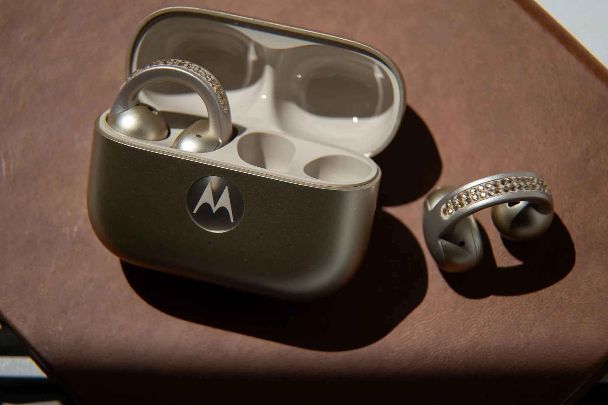 攝影師:Michael Nagle/Bloomberg攝影師:Michael Nagle/Bloomberg**水晶般清澈的音質。**摩托羅拉正攜手Bose推出施華洛世奇水晶鑲嵌耳機。Moto Buds Loop旨在成為時尚宣言,與新款1300美元融合AI技術的Razr Ultra同步亮相,標誌着聯想集團通過軟件與風格多樣化實現差異化的新努力。