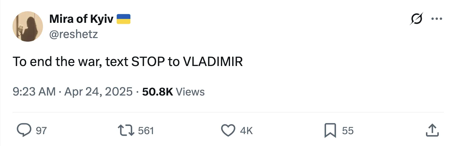 外交政策的等價物“派珀,不要啊”是他結束戰爭的天才計劃的一部分嗎?如果是這樣,那就太尷尬了。特朗普聲稱俄羅斯週四的襲擊“時機非常糟糕”。但只是好奇,他書中的好時機是什麼?上次我檢查時,結束生命從來都不是好時機。而懇求一個墮落的國外領導人冷靜下來——拜託了——這樣大家就可以圍坐在篝火旁做棉花糖夾心餅乾,在社交媒體帖子中並不是一個制勝策略。除非總統把表情包 算作勝利: