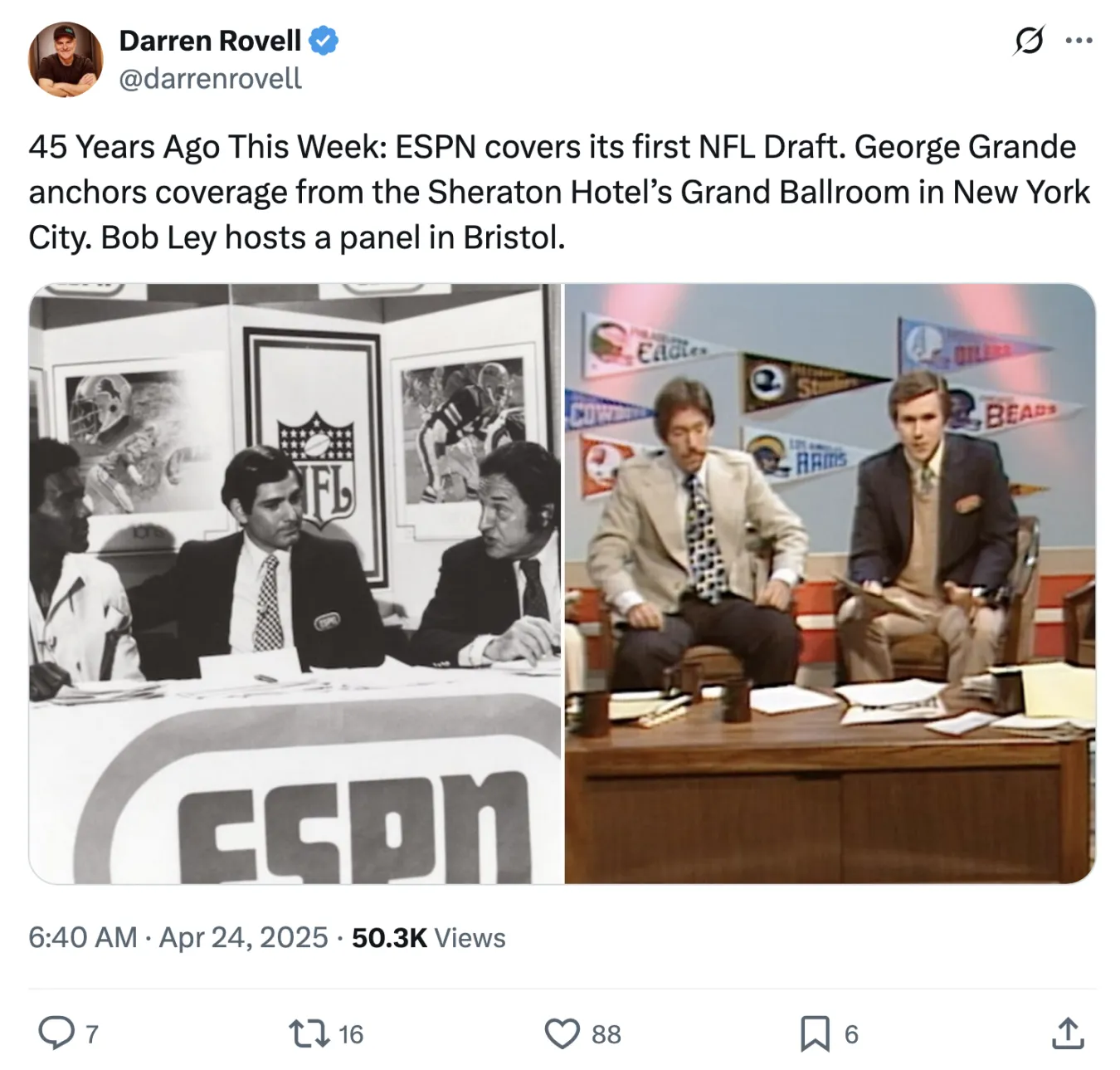 “從NFL的角度來看,選秀大會——結合美國人對大學橄欖球長久以來的熱愛——為聯盟提供了全年365天的潛在內容。這個曾經僅在秋季活躍的體育聯盟,已轉變為一場持續全年的對話,讓球迷和媒體全年保持參與,”他寫道。但45年後的今天,大部分選秀話題不再來自有線電視,而是源自喬·舍恩兒子的Instagram快拍。
